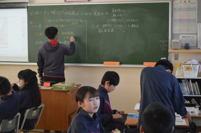 1年生は、地理分野の「世界の諸地域」の単元「アジア州」について、調べたことを学級で発表していました。「西アジア・中央アジアはどのように発展したのか」という課題に対し、歴史分野や理科で学んだ知識と結びつけながら、理解を深めていました。