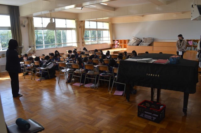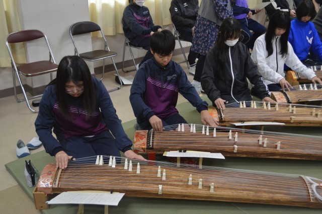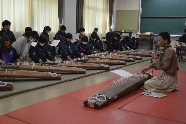 1年生の音楽では、和楽器に親しむ授業として「箏」の先生をお招きした授業を行いました。講師の先生の見事な手ほどきで、生徒たちはたった一時間の授業の中で、筝曲「さくら」を奏でられるようになり、得意げでした。