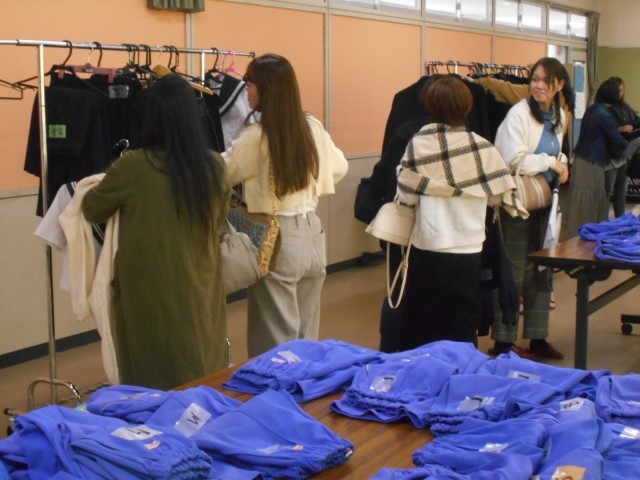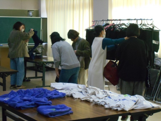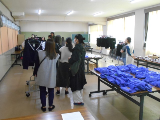 お昼前に、本館1階の視聴覚室で、PTAの制服等のリサイクル活動を実施しました。制服・体操服などあわせて数十点の出品を行いました。順序よく並んでいただき、数多くの品が譲りうけられました。今後も「物を大切にする心」をつないでいけるようにリサイクル活動に取り組んでいきたいと思います。次回は新入生(現小学校6年生)の保護者の方々を対象に、1月に実施する予定となります。