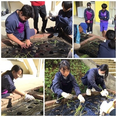 先週作った畝に、1組の生徒たちがタマネギを植えました。地域の方に植え方を聞き、白色と赤色のものを計200ほど植えました。収穫は来年の6月頃を予定しています。植えた直後は苗が横に倒れており、心配する生徒もいましたが、水を吸った後に起き上がるそうです。