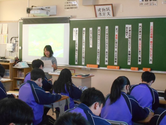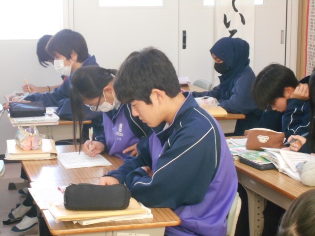 国語では、古文「おくのほそ道」を音読し、現代語訳と比較することで文章理解を深めました。松尾芭蕉の思い入れの深さについて、平泉の情景や源義経、奥州藤原氏をもとに具体的に話し合ったり、プリントの空欄を記入したりして要点をおさえました。