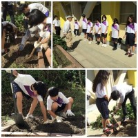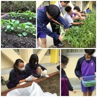 先週作った畝に、1組の生徒たちがタマネギを植えました。地域の方に植え方を聞き、白色と赤色のものを計200ほど植えました。収穫は来年の6月頃を予定しています。植えた直後は苗が横に倒れており、心配する生徒もいましたが、水を吸った後に起き上がるそうです。
