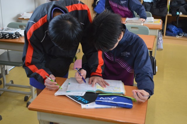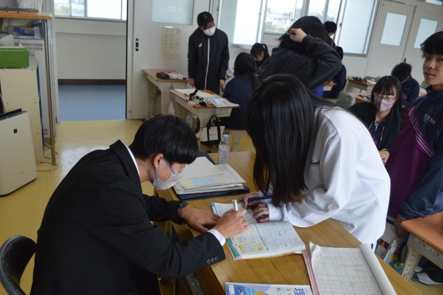 理科の授業では、テストに向け問題集に各自取り組んでいました。わからない点を質問しようと、先生の前には長い行列ができていました。