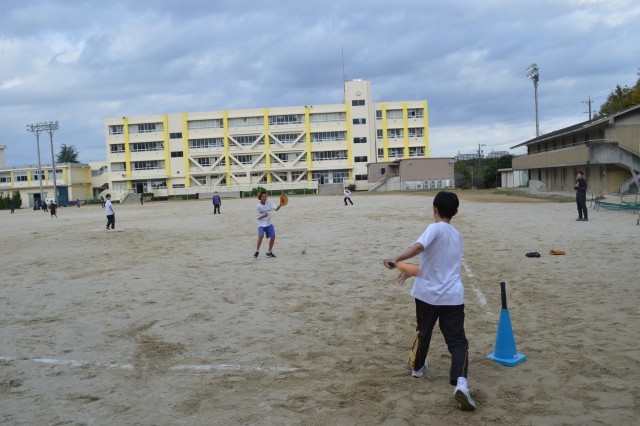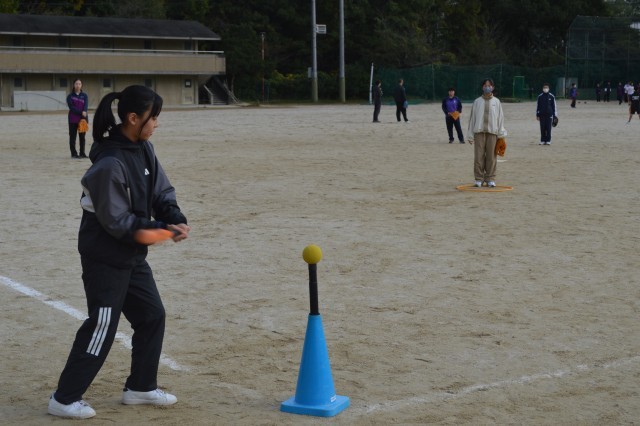 体育の野球の授業では、Tボールを使って攻守の練習を行っていました。止まっているボールでも、芯をとらえて打つのは難しいですね。