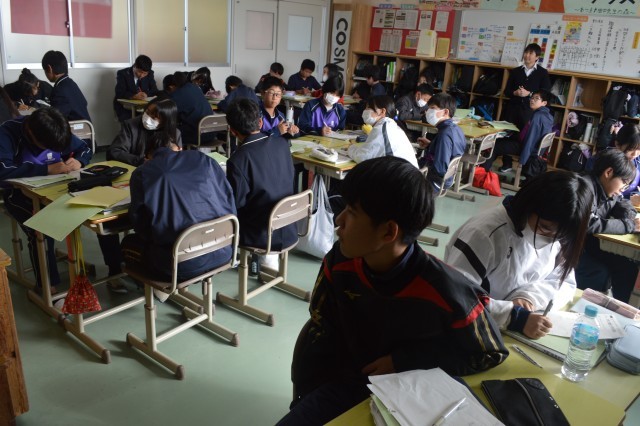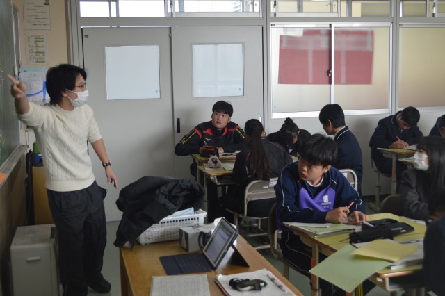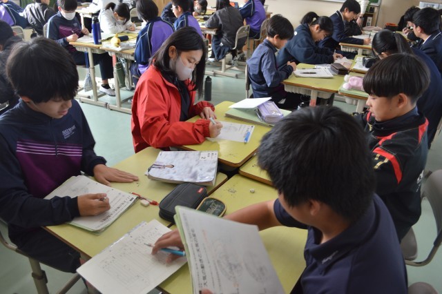「なぜ、風は場所によって吹く向きが異なるのか?」という問いに、生徒たちは持っている知識を総動員して、予想を立てます。「地球が回っているから?」「場所によって気温が違うから?」予備知識として、これまでの天文学者の仮説なども紹介し、現在の地球上で発生している風の仕組みや名前について確認していました。「社会で学んだ偏西風ってそういうことだったのか」と、教科を超えた学びへの気づきの声も上がり、教室は大いに盛り上がりました。学びの深まりを感じられる一コマでした。