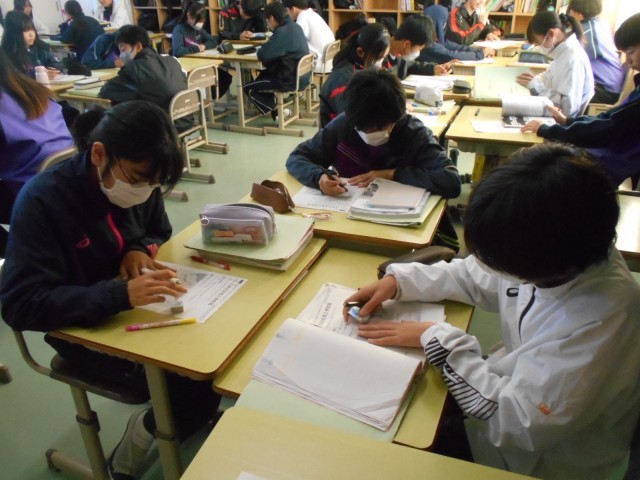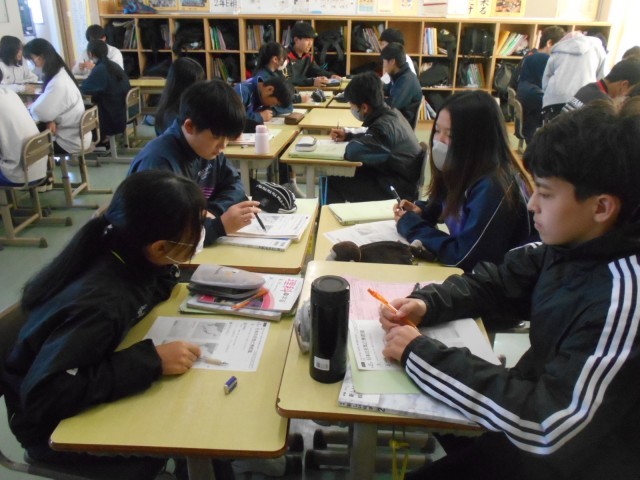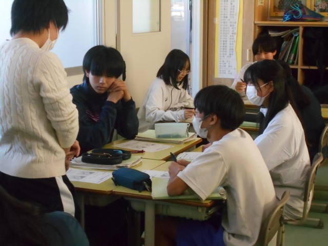理科では、日本の季節風について高気圧から低気圧までの風の流れをもとに学習をすすめました。特に、日本付近での風のふき方をプリントにある地図に記入し、グループでの話し合いや発表や説明につなげて理解を深めていました。