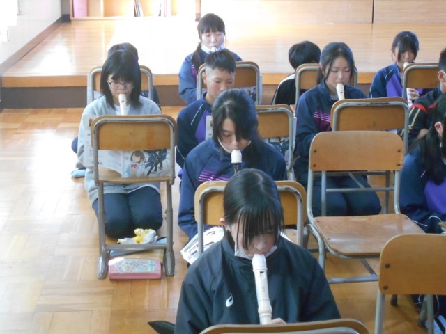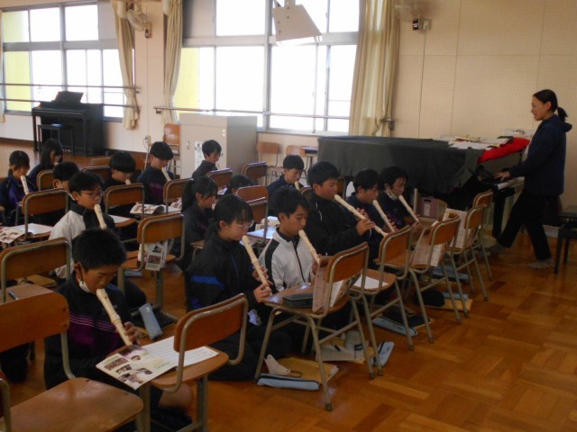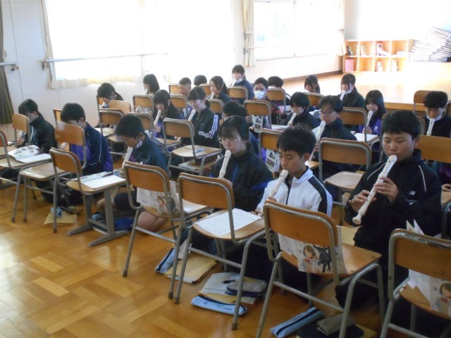 音楽では、唱歌「蛍の光」をアルトリコーダーで演奏しました。みなさんの音がきちんとそろっていたので、きれいなメロディが音楽室いっぱいに響きわたる素晴らしい演奏でした。演奏後には、アルトパートの音階を確認することができました。