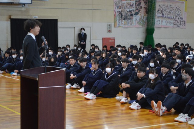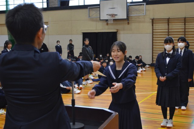 まずは伝達表彰です。女子バレーボール部と人権作文、NIHONGO(にほんご)スピーチコンテストで入賞した代表者が表彰を受けました。おめでとうございます。