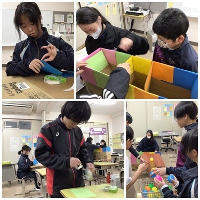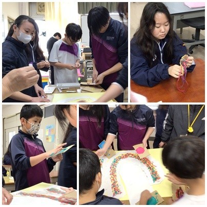 1組は先週に引き続き、工作に取り組みました。段ボールが見えているところには、色紙を丁寧に重ねて貼り、きれいな仕上がりにしていました。完成した後は、みんなで動き具合を確かめていました。くみひもづくりに挑戦する生徒も、黙々と作業に取り組んでいました。