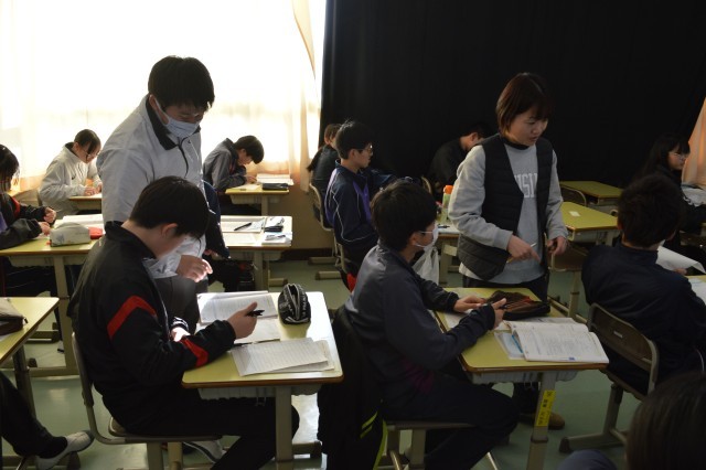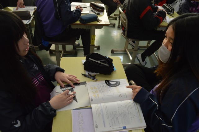 2年生の数学では、図形の性質をコンパスや三角定規を用いて学んでいました。一人で黙々と課題に取り組む生徒もいれば、座席が前後の生徒同士で相談しながら取り組む生徒もいました。学習課題は同じですが学ぶ過程や方法は人それぞれで、個に応じた学びの姿が見られました。