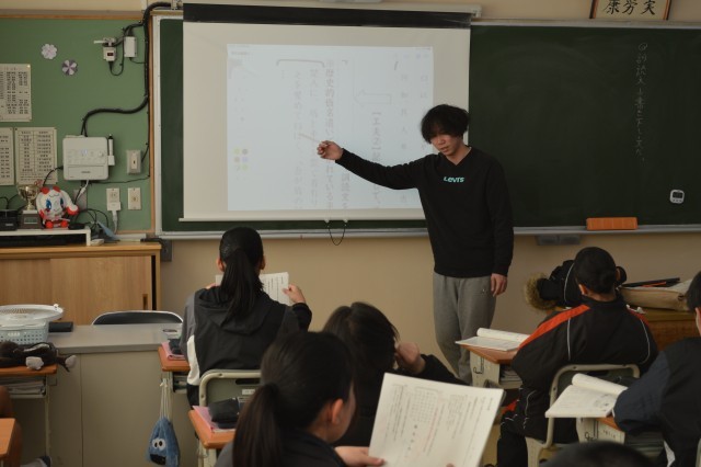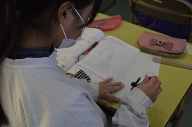 1年生の国語では、漢文の朗読を行っていました。漢文の種類とその意味について、スライドを用いながら声に出して確認していました。「矛盾」という言葉の成り立ちがわかる有名な一節を、生徒たちはそれぞれのペースで読み上げていました。