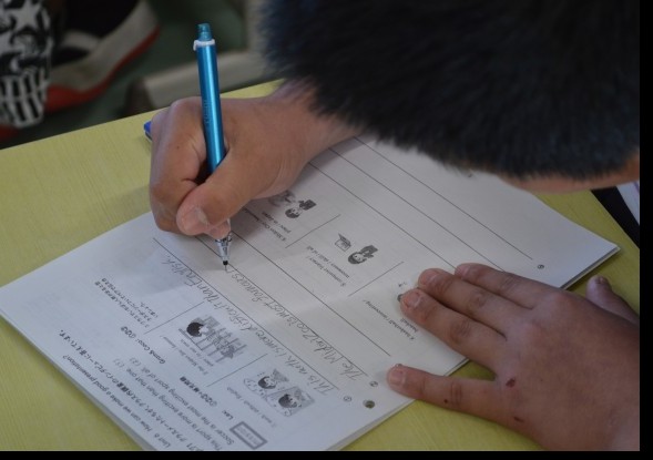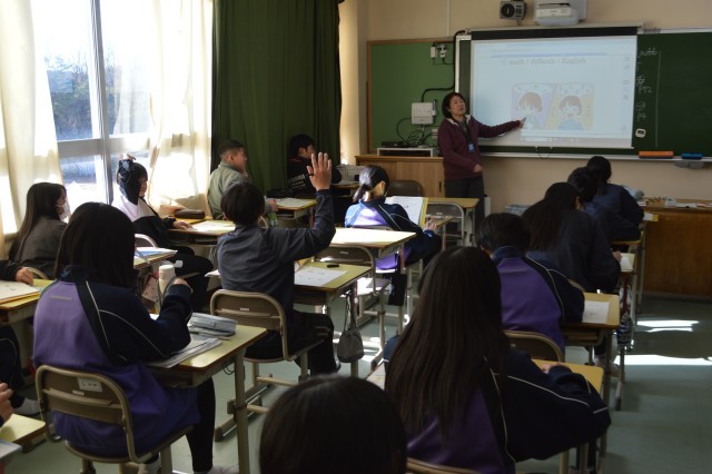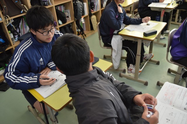 2年生の英語の授業です。「●●へはどうやって行ったら良いですか?」道を尋ねる表現とその答え方について学びます。「この道をまっすぐ進んで…」日本語ではすぐ出てくるのですが、英語となると、少し勝手が違うようです。近隣の生徒と相談しながら、文章を考えていました。