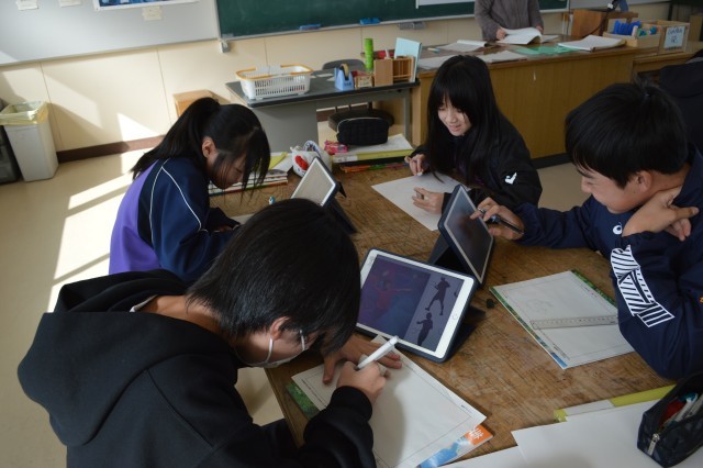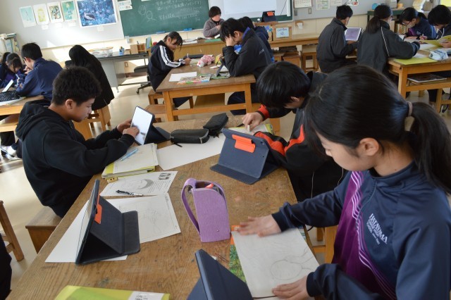 1年美術では、自画像の下絵を描いていました。各自タブレットでデザインとなるイメージを検索し、参考にしながら黙々と取り組んでいました。