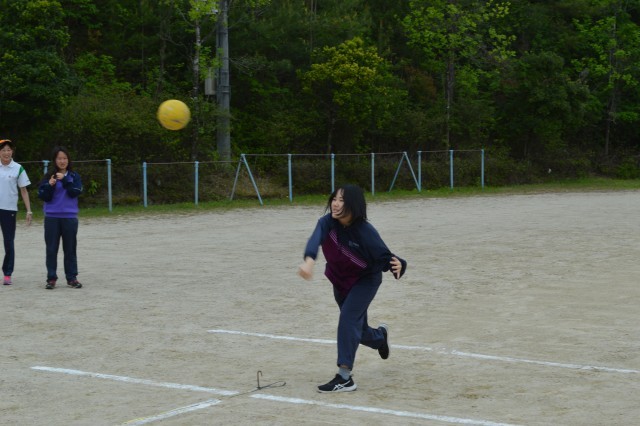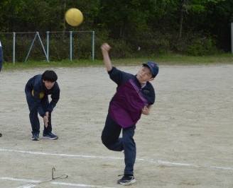 4月は体力テストに向けた計測を行っています。3年生は50m走、1組はハンドボール投げを行っていました。