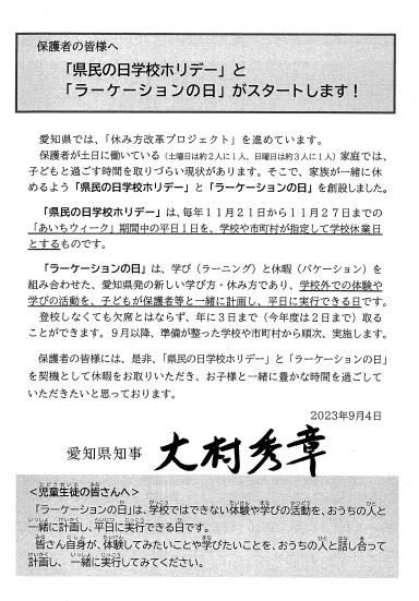 「県民の日学校ホリデー」と「ラーケーションの日」に係る「知事メッセージ」について