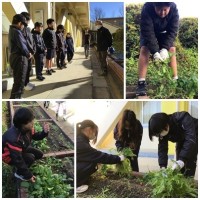 1組は、2時間の畑作業を行いました。地域の方との2か月ぶりの再会を喜びながら、カブ、ダイコン、ブロッコリーの収穫をしました。ブロッコリーはスーパー等で販売されているサイズまで育ったものもありました。また、カブを採った際には「先生、ここがキラキラしてきれいだよ」と、太陽に反射した霜の美しさを伝えてくる生徒もいました。昼休みには、恒例になった教職員への野菜販売も行いました。