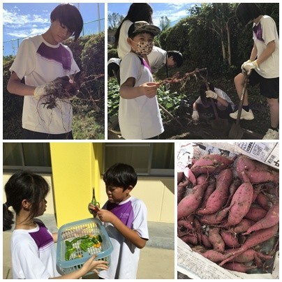 1組は、7月に植えたサツマイモの収穫を行いました。スコップを用意し、みんなで土を掘りましたが、あまり出てきませんでした。地域の方曰く、「猛暑の影響ですかね」とのことでした。しかし、あきらめずに掘り進めると、下の方からサツマイモが見つかりました。見つけた瞬間には「わぁーー!!」という歓声が聞こえてきました。