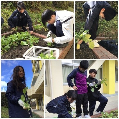 また、小松菜や水菜の大きなものを選んで収穫しました。小カブやダイコンの間引きも行い、水洗いまで丁寧に行うことができました。カゴ3つ分も収穫することができ、生徒たちは喜んでいました。