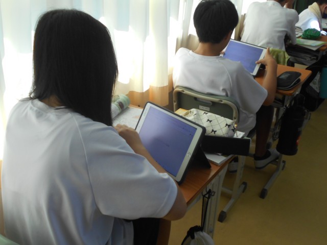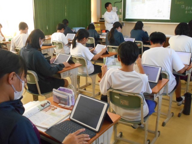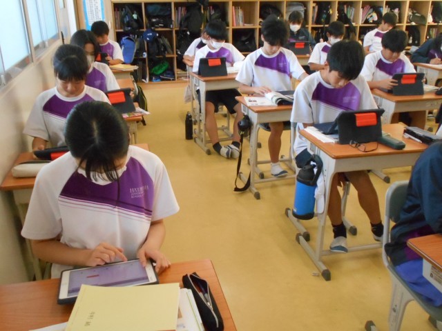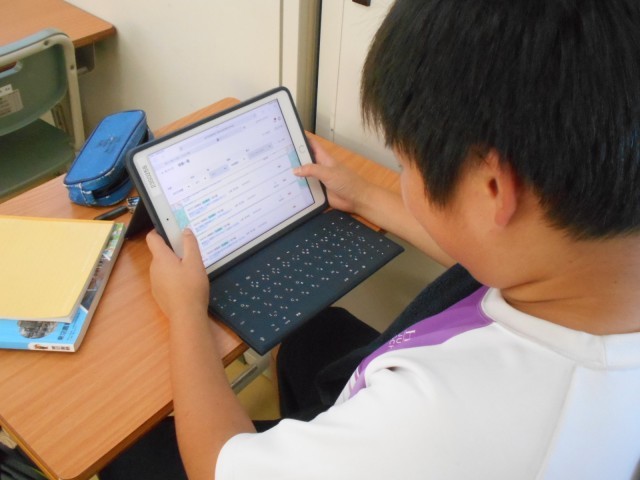 社会では、平安時代の貴族中心に育んだ国風文化について、浄土信仰やかな文字など学習課題の理解や確認をしました。その後、タブレットを活用して、今までの課題の振り返りを入力していました。
