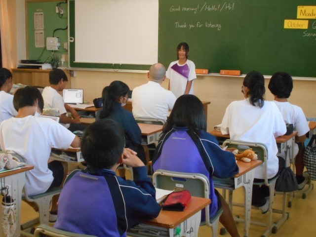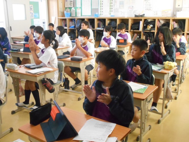 英語では、ALTが自己紹介の手本を教示した後、級友のスピーチを始めました。スピーチでは、出身小学校や好きなものが紹介されると、聞いたみなさんはNice to meet you!と笑顔や拍手でこたえていました。