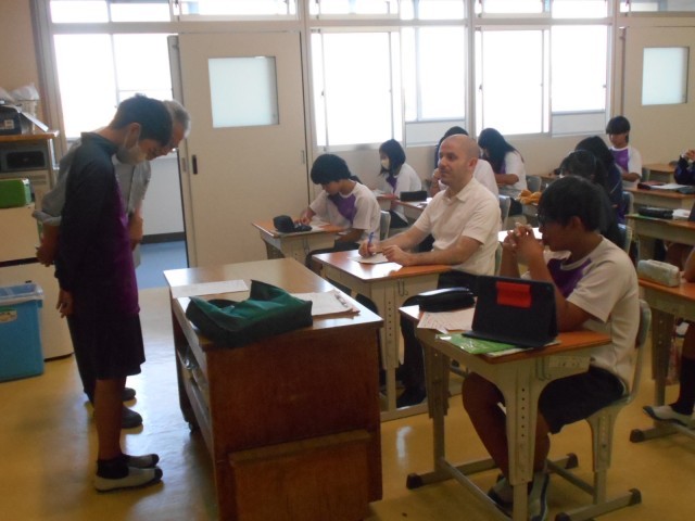 社会では、室町時代の東アジアとの交易についての内容でした。海賊と正式な貿易船を区別するために用いられた「勘合」という証明書の工夫を紹介すると、生徒は相槌を打ちながら教師の解説に耳を傾けていました。