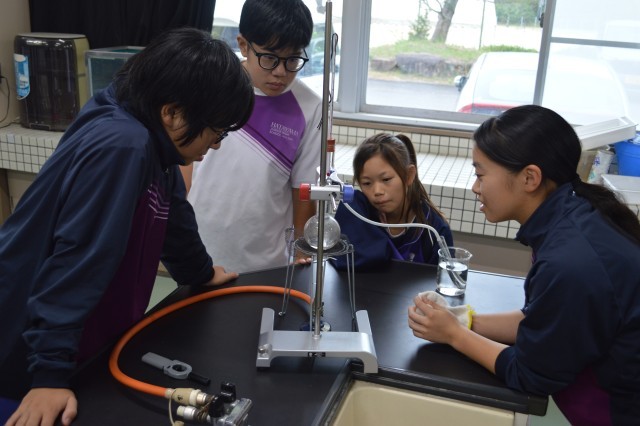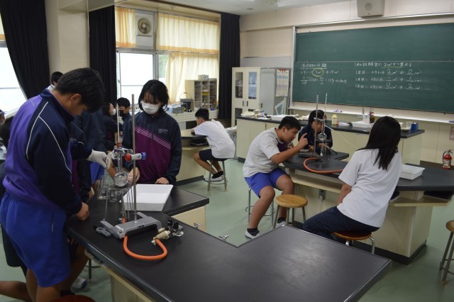 理科の授業では、混合液を沸騰させ、物質の性質を利用して分離させる実験を行っていました。火を扱う実験ということで、生徒たちは慎重に器具を取り扱っていました。