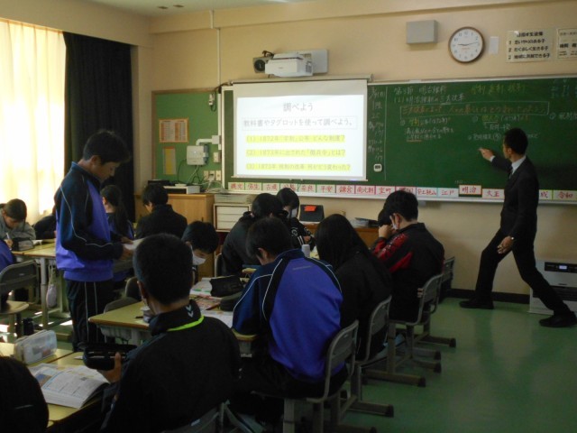 社会では、明治維新の三大改革である学制・徴兵令・税制改革によっておきた人々の暮らしの変化について、グループで調べ・話し合い・まとめる活動にそれぞれ取り組みました。3つの課題のうちの1つをグループで選んで発表を聞くことで、学習課題への理解を進めました。