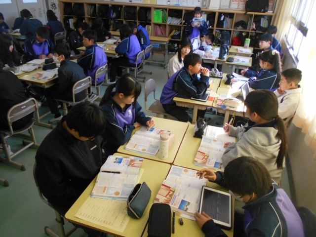 社会では、東北6県の伝統産業・文化について調べました。6県を2県ずつ3種類の調べる課題に分け、ハタトークグループでどの2県にするか話し合い、各グループでまとめた後、発表を行いました。
