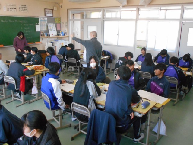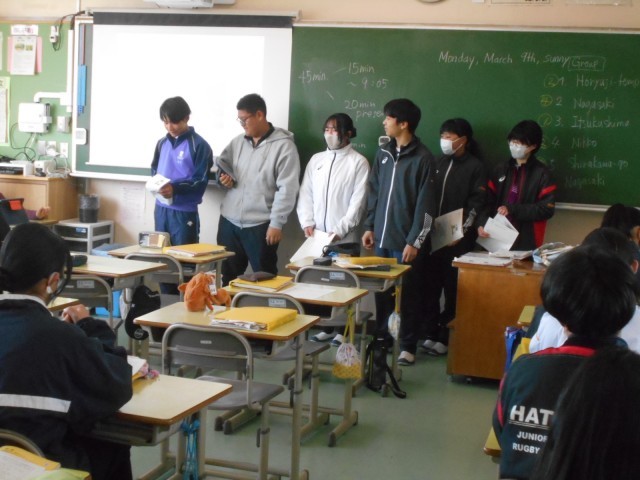 英語では、教育実習生がデジタル教科書を活用しつつ授業をすすめました。例えば、I finished あるいは I enjoyed +○○ing形というように、動名詞の使い方を学ぶ場面です。週末の3連休の話題で何か使えないかと、考えたり、話し合ったりしました。