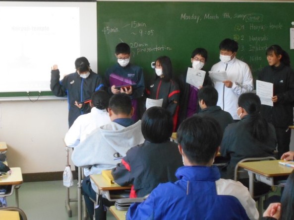 英語では、世界遺産についての発表会を行いました。先週の授業中、グループごとにタブレットで作成したその資料や発表用原稿をもとに、一人ずつがAll Englishで順番にプレゼンテーションしました。