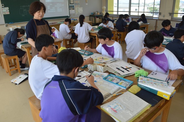 1年生の美術では、生徒自身が考えた文字デザインに彩色を始めていました。パレットの絵の具に水を混ぜ、思い思いのデザインの作品作りを進めていました。