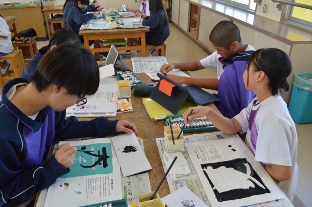 1年生の美術では、文字のイメージをイラストで表現する作品をつくっていました。タブレットを参考にイメージを膨らませたり、色の濃淡で文字をデザインしたりと、人それぞれに取り組んでいました。