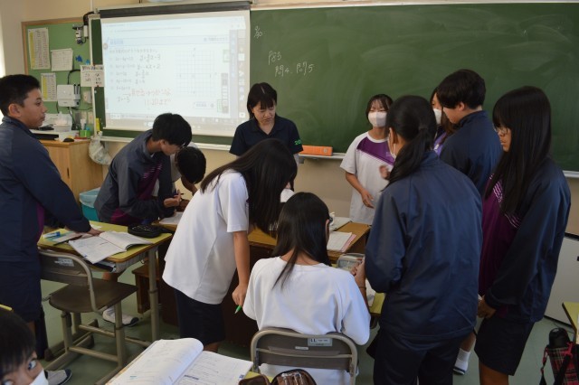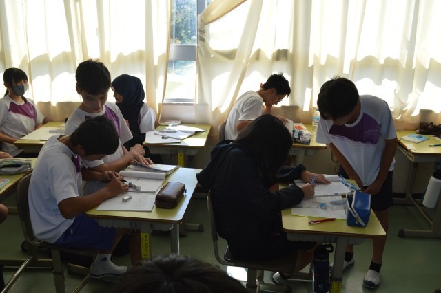 2年生の数学では、関数グラフの課題にそれぞれが取り組んでいました。教室のあちらこちらで、自然と教え合う雰囲気が生まれていました。教える立場に立つことで、自分自身の理解も深まっていきますね。