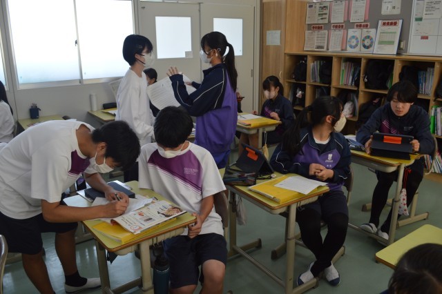 3年生は、公民分野の「民主政治と憲法」の単元「行政の役割」について、調べたことを班で確認していました。「大きな政府」の特徴と問題点を、教科書やデジタル資料集を用いながら話し合い、理解を深めていました。