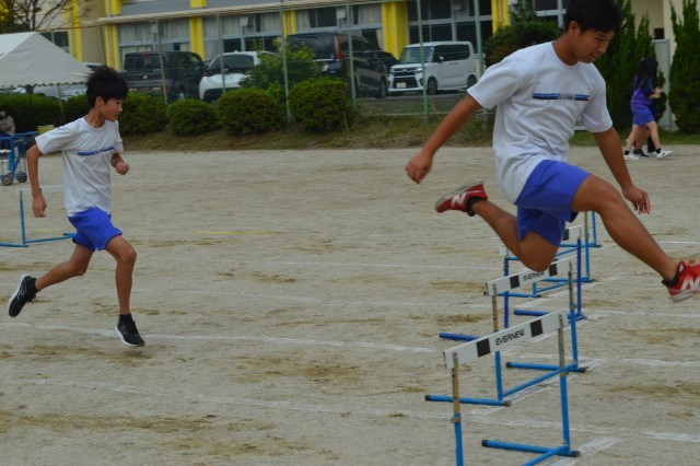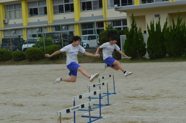 3年生の授業では、ハードル走の計測を行っていました。 ハードルを越える時の足さばきと、直線でのダッシュがタイムを縮めるためのポイントです。友人とフォームやハードリングの動きを確認しながら、多くの生徒は練習の成果を発揮しているようでした。