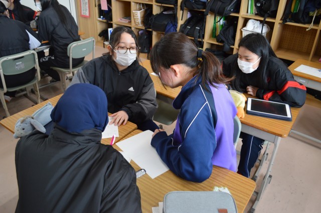 2年生の英語の授業です。「●●へはどうやって行ったら良いですか?」道を尋ねる表現とその答え方について学びます。「この道をまっすぐ進んで…」日本語ではすぐ出てくるのですが、英語となると、少し勝手が違うようです。近隣の生徒と相談しながら、文章を考えていました。