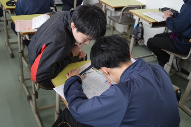 2年理科では、オームの法則を用いた計算問題に取り組んでいました。つなぎ方が異なる電気回路を前に、思考回路が止まっている生徒もいました。しかし、理科が得意な生徒が先生役となり、考え方や計算方法を教えると、合点がいったようで筆記具を走らせていました。