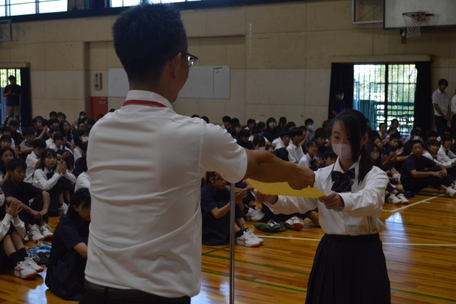 体育館で最初に、男(優勝)女(3位)バスケットボール部、女(愛日3位)ソフトテニス部と、市(入賞)読書感想文コンクールについて、優秀な成績に対しての伝達表彰がありました。おめでとうございます。