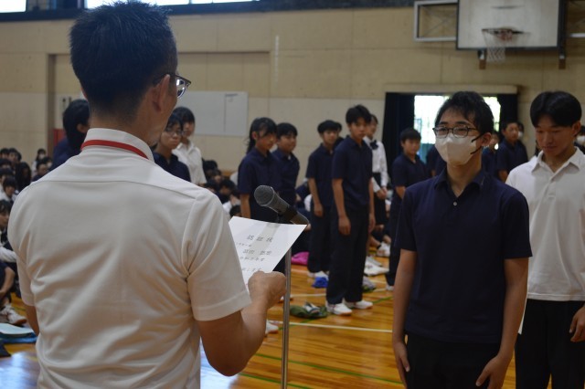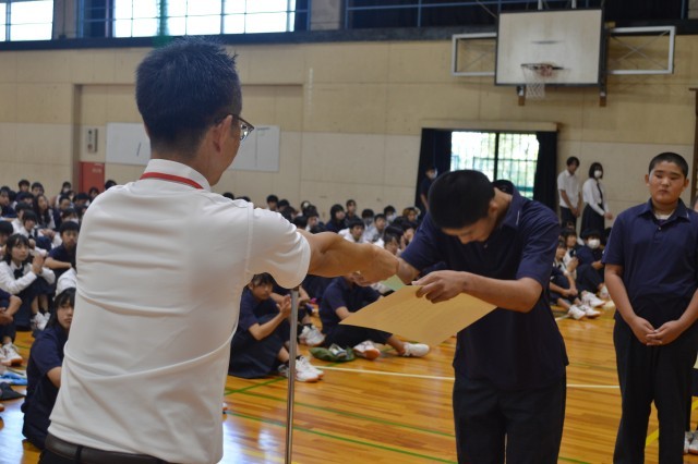 初めに伝達表彰がありました。バレーボール部、男子バスケットボール部、女子バスケットボール部、剣道部の個人1名が各種大会に入賞し、表彰を受けました。おめでとうございます。