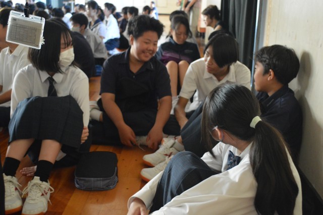 最後に、通級担当からの講話です。「自分の○○と向き合い、作戦会議をするところ」○○にあてはまる言葉を、生徒たちはハタトーク形式で予想し合っていました。「苦手」や「失敗」などの言葉があてはまるようですが、それらと向き合うことで人は成長し、次のステップに進むことができます。「学校生活でうまくいかなかったり、困ってどうしたらよいかわからなかったりすることに対して、一緒に考えていきましょう」という通級担当の言葉に、生徒たちは安心感を感じているようでした。