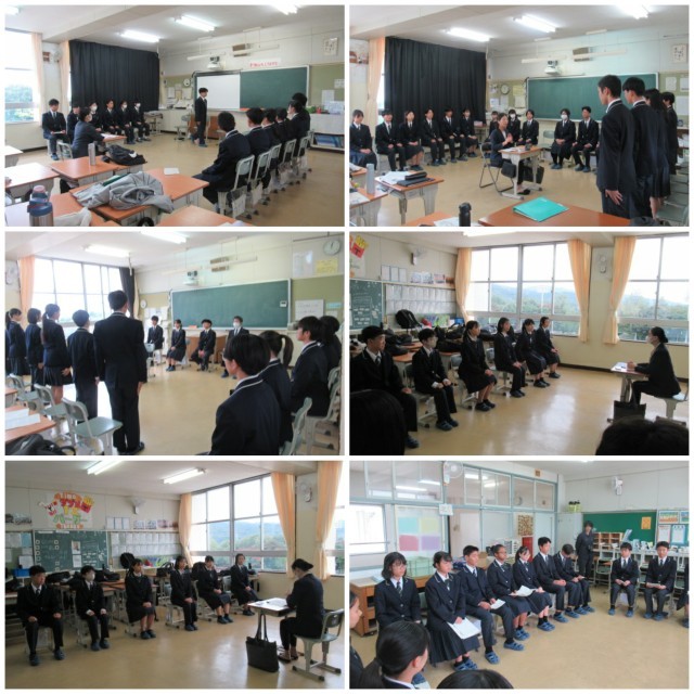 4名の講師を迎え、2年生はマナー講座、3年生は面接講座をおこないました。服装のマナー、あいさつ、返事、言葉遣いなどについて教えていただきました。「初対面の相手には、態度や言葉に表さないとこちらの気持ちは伝わらない」という言葉が印象的でした。