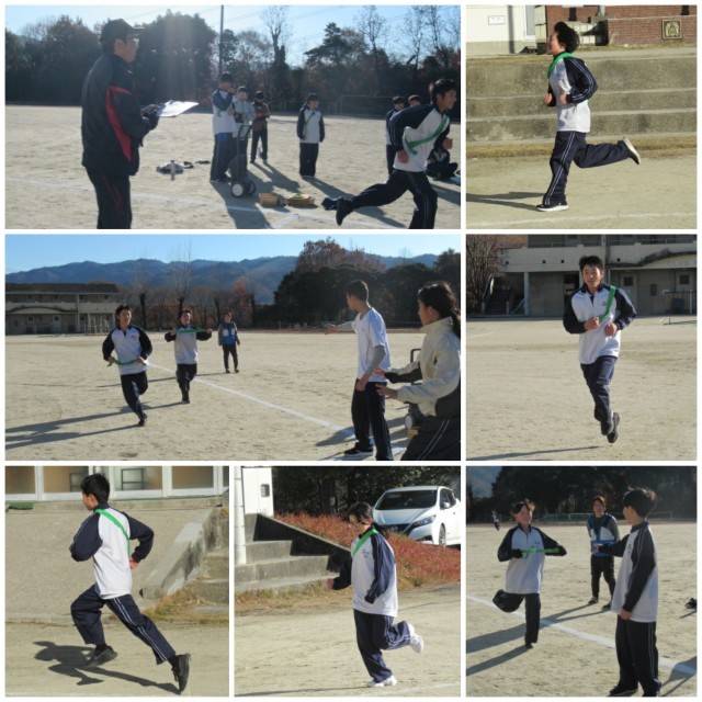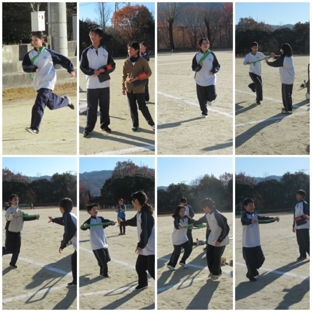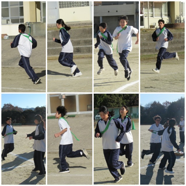 1年生の体育で、駅伝をおこなっています。3~4人のグループになり、たすきをつなぎます。たすきの受け渡しも上手になってきました。