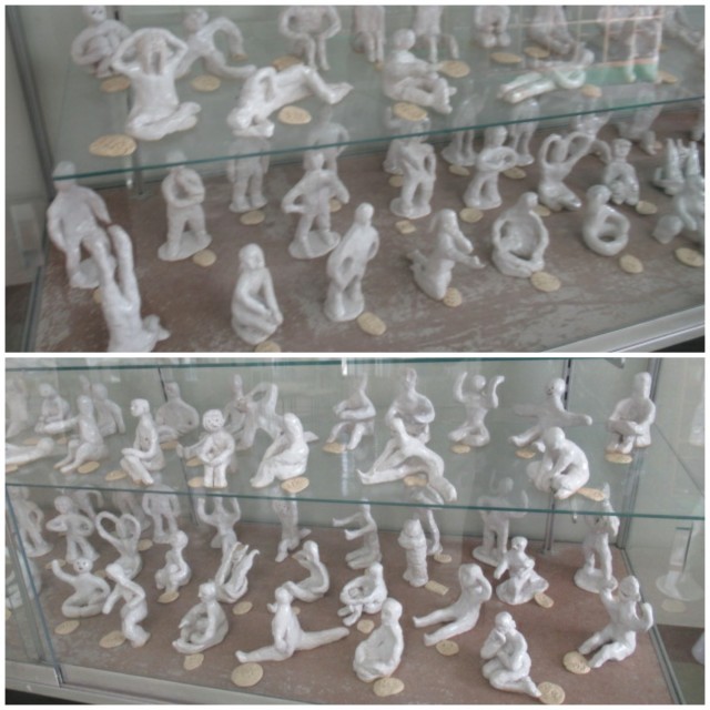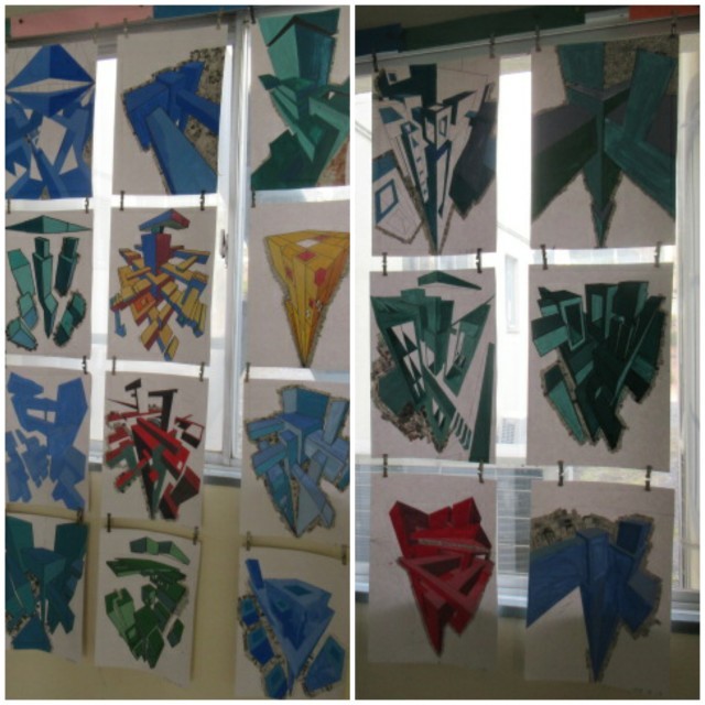 3点透視法による平面構成です。絵の具に白や黒を混ぜ、明暗をつけて立体的に表現しました。周りに細かくちぎった新聞紙を貼り、無彩色と有彩色の対比を狙いました。3枚目の写真は、3年間の総仕上げとして自分の体を作りました。全員分、割れずに出来上がりました!