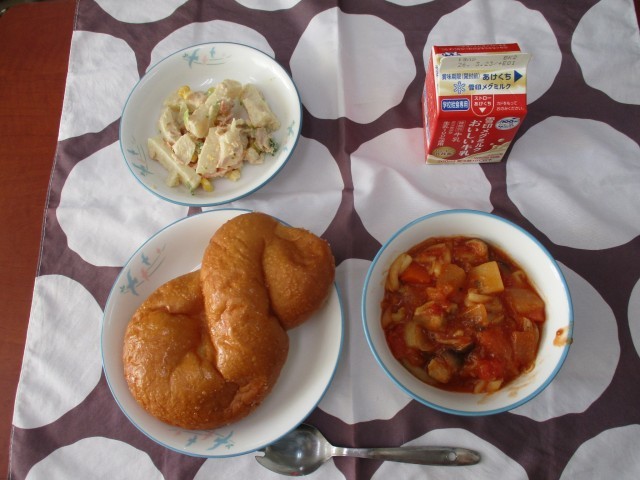 今日の給食は、揚げパン、鶏肉と野菜のトマト煮込み、ブロッコリーとツナのポテトサラダ、牛乳です。