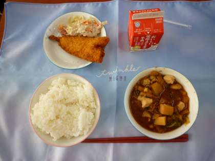 今日の給食は、ごはん(瀬戸市産ミネアサヒ)、瀬戸市産さつまいも入りみそ汁、愛知県産ニギスフライ、レンコンのあえもの、牛乳でした。今日は、「地元の食材を味わう学校給食の日」ということで、愛知県や瀬戸市でとれた食材をいつもより多く使っています。