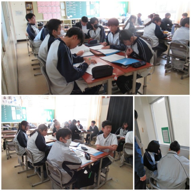 3年生のテスト中の様子です。他の学年とはひと味違う緊張感が漂っています。頑張っている姿は美しいです。