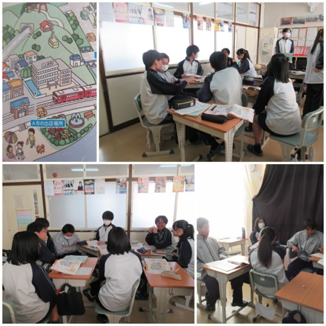 「資金が500万円あります。コンビニを出店するなら、A市、B市、C市のどこがいいですか?」という課題に対して、客や店員などさまざまな立場になって考えながら、みんなに長く愛される店にするにはどうすればよいのかを話し合いました。今の公民の授業って、実践的でおもしろいですね。