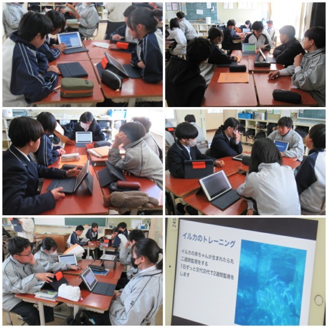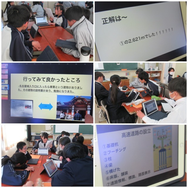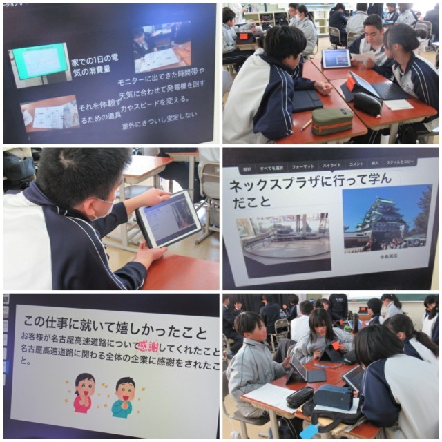 名古屋班別研修のまとめを、グループ内で発表し合いました。クイズ形式にするなど、それぞれが工夫をこらしてまとめていました。