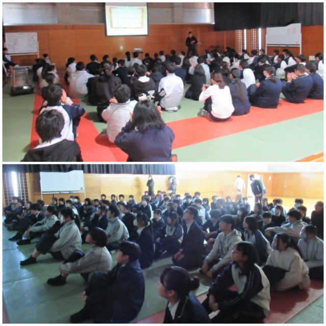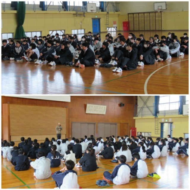 今日の全校集会では、3年生の学年主任からの話がありました。卒業生を送る会や卒業式に向けて準備してくれたことへのお礼が伝えられました。また、「品野中の伝統」について、これまでの応援団長たちからのビデオメッセージも紹介され、みんなでその思いを受け取りました。