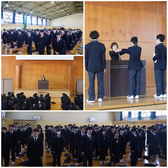 今日は修了式でした。A組、1年生、2年生の代表生徒が修了証書を受け取りました。この1年間、それぞれがよく頑張り、大きく成長した姿を見ることができました。